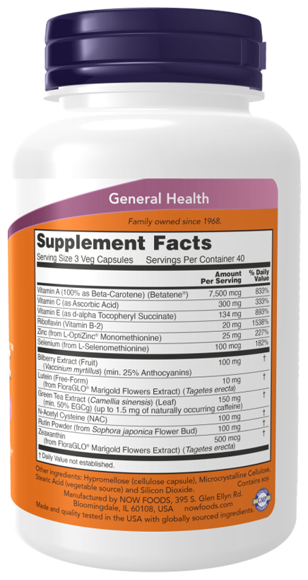 Now Ocu Support содержит полный спектр питательных антиоксидантов, которые способствуют поддержанию нормальной работы органов зрения. Одна ежедневная порция Ocu Support содержит 10 мг лютеина, каротиноида, содержащегося в темно-зеленых листовых овощах. Лютеин - это преобладающий пигмент в макулярной области глаза. Добавка также содержит антиоксидантные витамины A, C и E и вспомогательные питательные вещества, необходимые для нейтрализации свободных радикалов, вырабатываемых под воздействием солнечного света. Кроме того, экстракт черники содержит биологически активные флавоноиды, поддерживающие нормальное зрение.