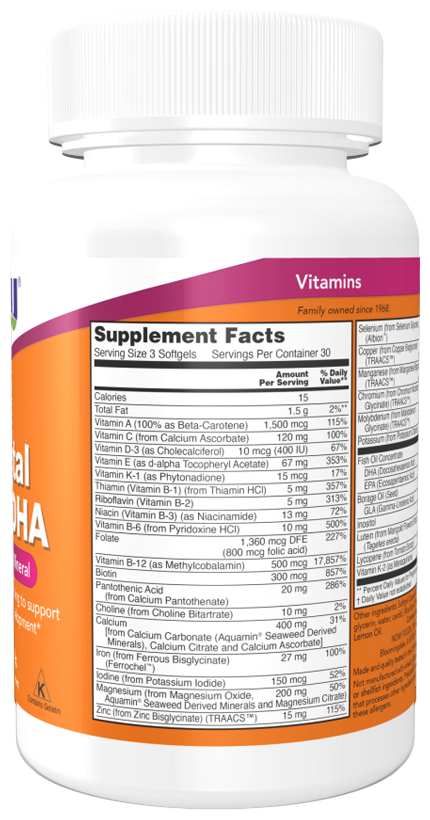 | Омега-3 (из концентрата рыбного жира), карбонат кальция (из морских минералов красных водорослей), цитрат и аскорбат кальция, натуральное масло лимона, соевый лецитин, масло бурого риса, пчелиный воск (Е901), оксид магния, магний из морских минералов красных водорослей, цитрат магния, бисглицинат железа, масло из семян бурачника, аскорбиновая кислота, бисглицинат цинка, d-альфа-токоферола ацетат, хлорид калия, d-пантотенат кальция, бисглицинат меди, никотинамид, холина битартрат, инозит, пиридоксина гидрохлорид, бисглицинат марганца, аминохелат хрома, тиамина гидрохлорид, рибофлавин, бета-каротин, фолиевая кислота, аммония молибдат, лютеин, ликопин (из экстракта томатов), биотин, йодид калия, селенометионин, фитоменадион, метилкобаламин, холекальциферол, желатин, глицерин (Е422), вода, камедь рожкового дерева (Е410) |